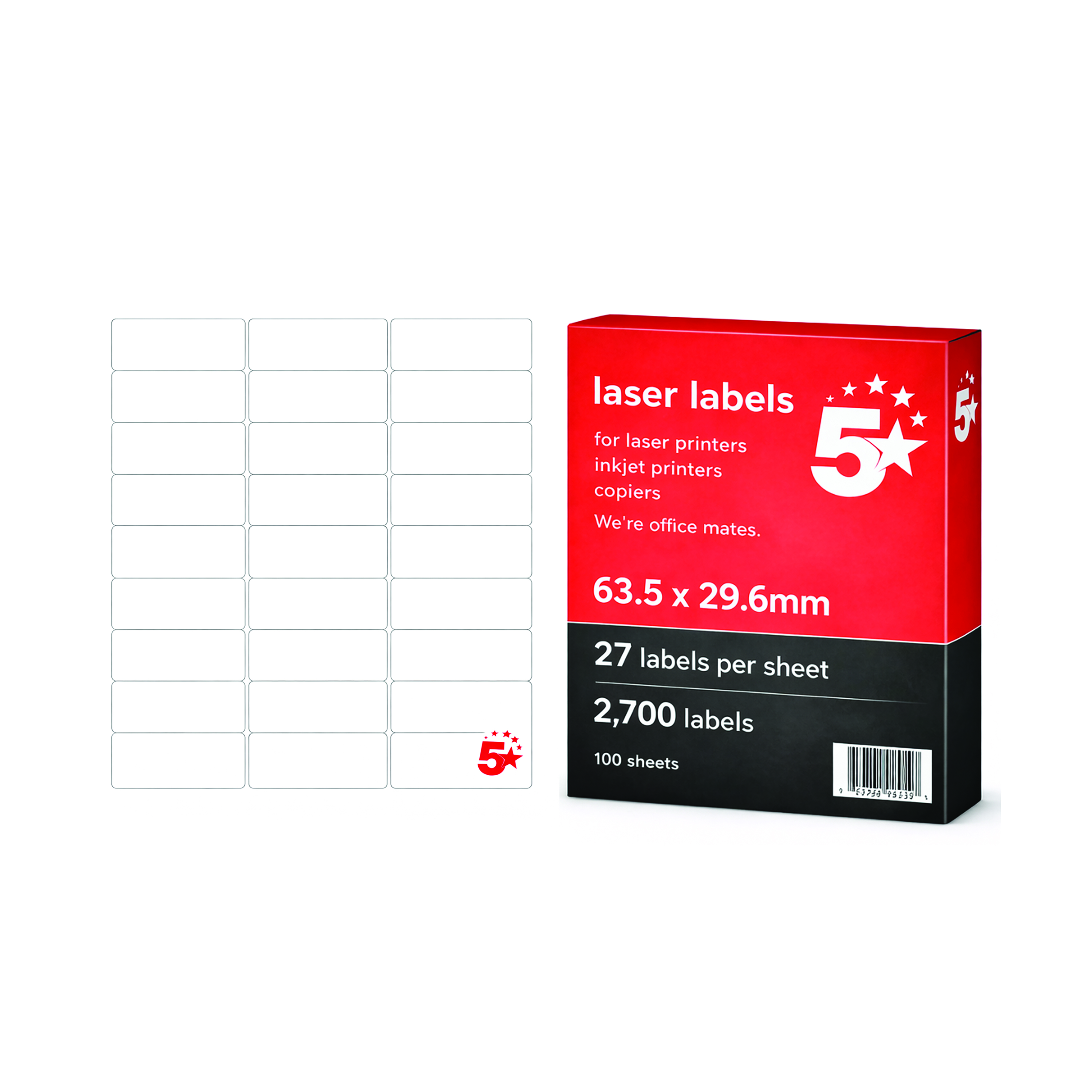 5 Star A4 Mini Sheet Labels 63.5x29.6mm 27 Labels per Sheet 100 Sheets (Pack of 2700) FS679600